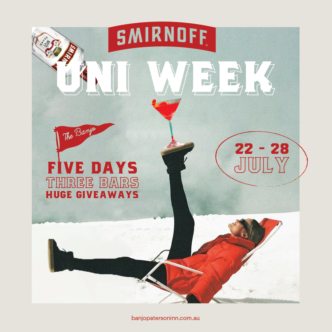 Get ready to hit The Banjo as UNI WEEK takes over the mountains! Thanks to Smirnoff, we’ve lined up FIVE huge nights of fun with DJ’s, trivia, Mario Kart, and epic daily giveaways!