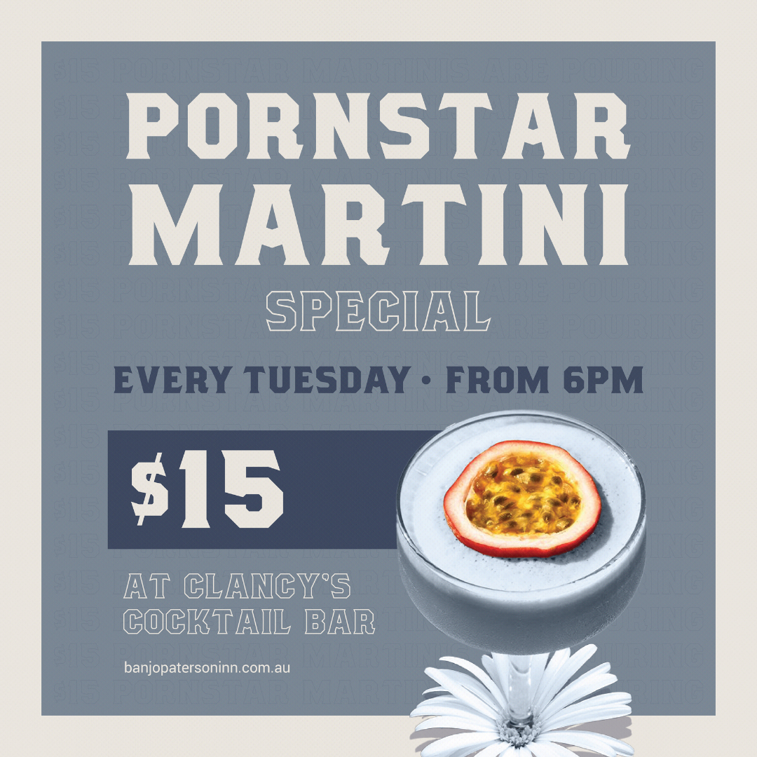 From 6pm every Tuesday sip on our $15 Porn Star Martinis - sweet, smooth, and a little bit cheeky (just how we like ‘em).