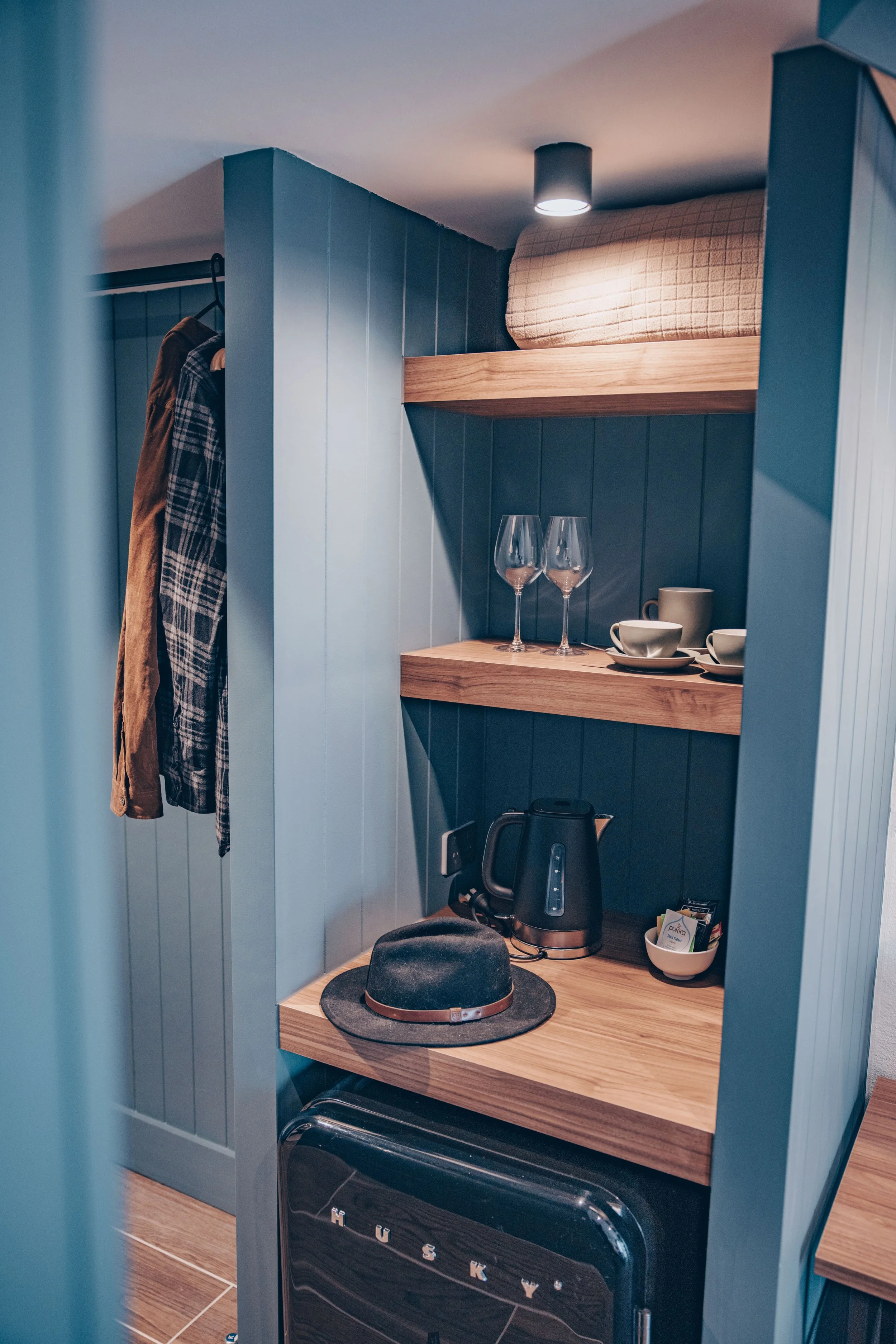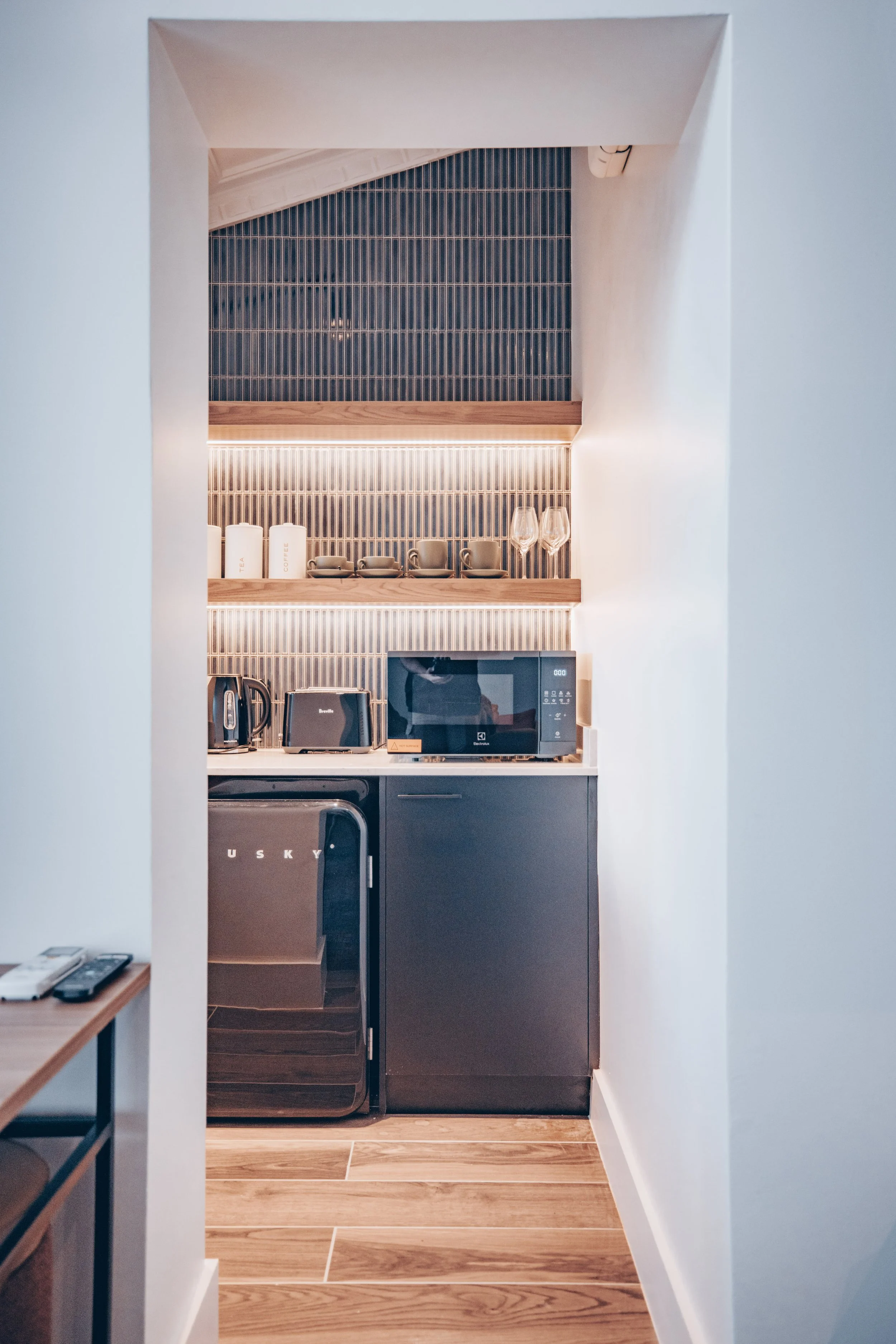 Kitchenette with heating appliances, toaster, mini fridge, cutlery, boutique tea and coffee